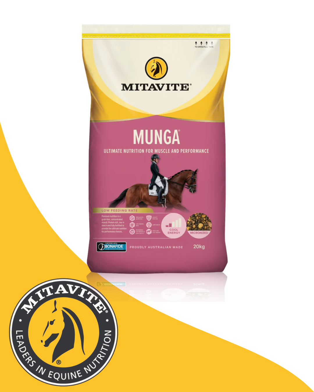 With its grain- free formulation and low starch content, Munga provides cool energy without the risks associated with high starch diets. This low feeding rate, nutrient - rich concentrate has a quallity amino acid profile, making it the optimal choice for horses in work and those aiming to excel in compettion. Whether training, competing or recovering from illness or injury, Munga supports every stage of your horses performance jpurney.